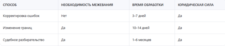 Эта таблица поможет вам выбрать наиболее подходящий вариант. Если речь идёт о технической ошибке, например, неверно внесённых координатах, можно подать заявление на корректировку без повторного межевания. Если же требуется изменить реальные границы, то потребуется полное межевание и согласование с соседями. А если возник спор, возможен судебный порядок.