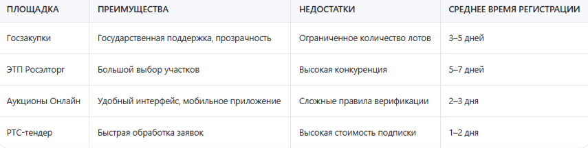 Эта таблица показывает, что выбор площадки зависит от ваших целей. Если вы ищете государственные участки, лучше всего подойдут Госзакупки. Для частных лотов — РТС-тендер или Аукционы Онлайн. Каждая площадка имеет свои особенности, поэтому важно заранее изучить их правила и отзывы других участников.